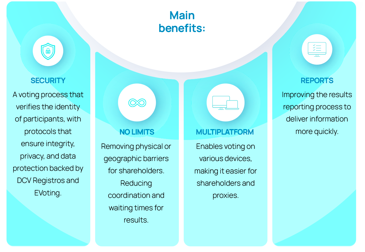 DCV Registros (DCVR) informs issuers that, starting January 2026, the Meetings Service will no longer be available through the DCVR software that utilizes paper ballots. All events will now be organized by DCV Registros using the EVoting platform, in partnership with a company that enhances the digitization and efficiency of these processes.