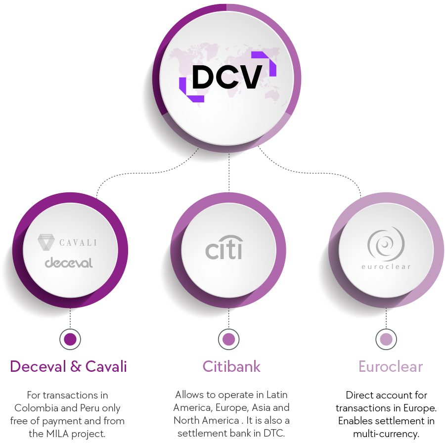To offer this service, DCV has entered into agreements with the following custodians: Citibank, Euroclear, and DECEVAL (Colombia).